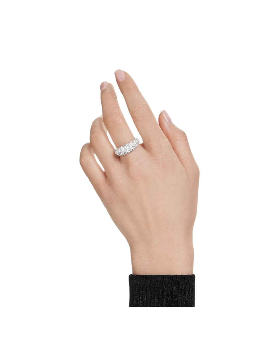 Anello bombato a fascia decorato con Swarovski Zirconia trasparenti, incastonati utilizzando l'esclusiva tecnica chatonnage. Realizzato in lega metallica con una placcatura in rodio.