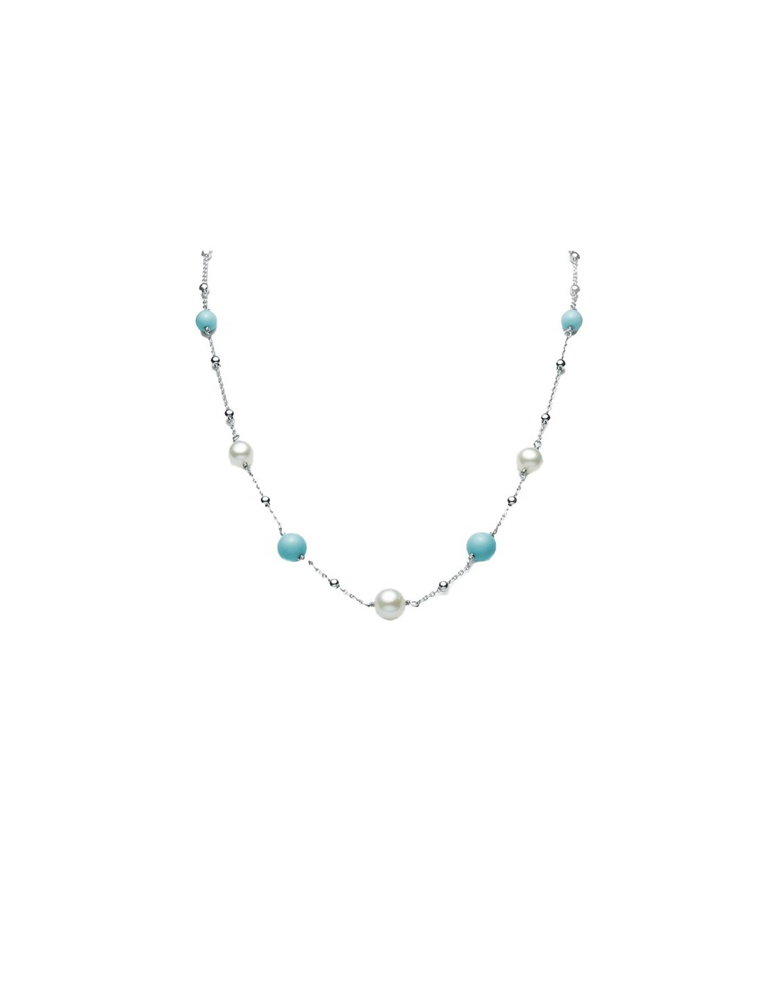 Con sfere di agglomerato turchese e perle bianche delle dimensioni di 6/8 mm.