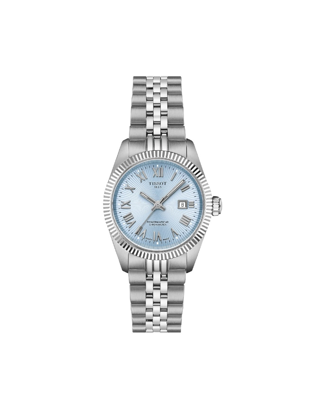 di cronometro COSC, con quadrante azzurro ghiaccio indici a numeri romani e datario.