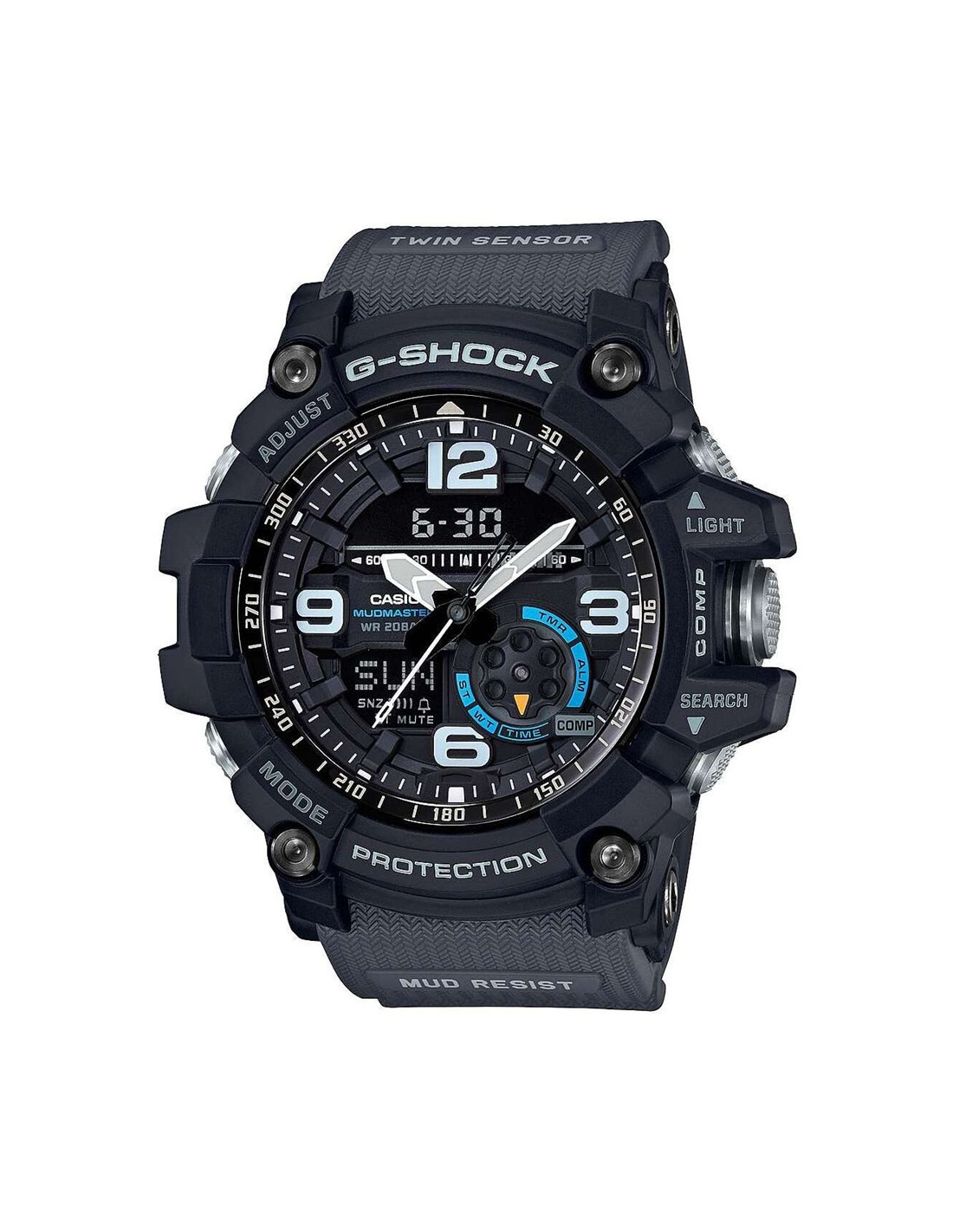 E' un orologio analogico-digitale tradizionale robusto della serie Mudmaster, progettato per resistere a fango e urti. Modello "Twin Sensor" con bussola digitale, termometro e retroilluminazione.